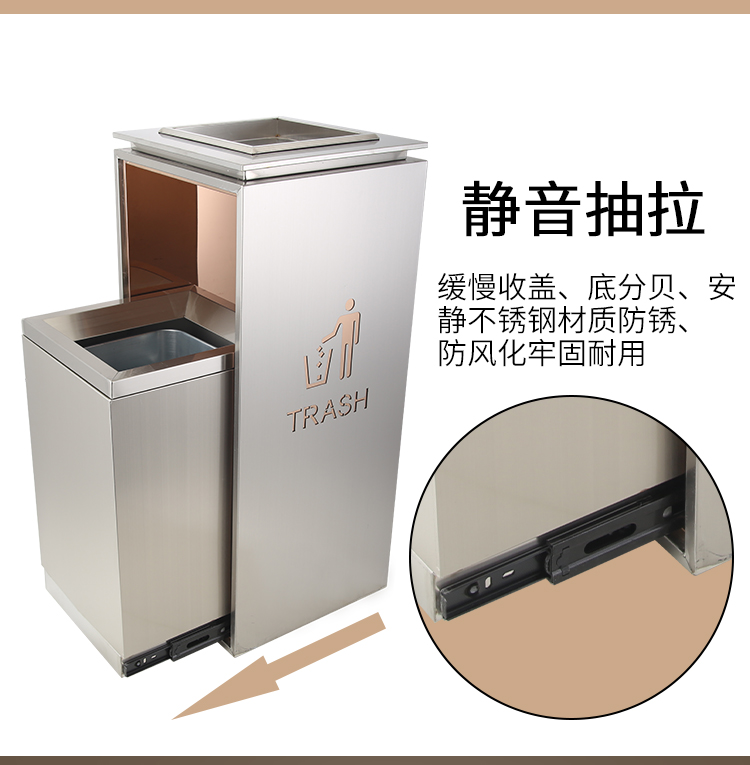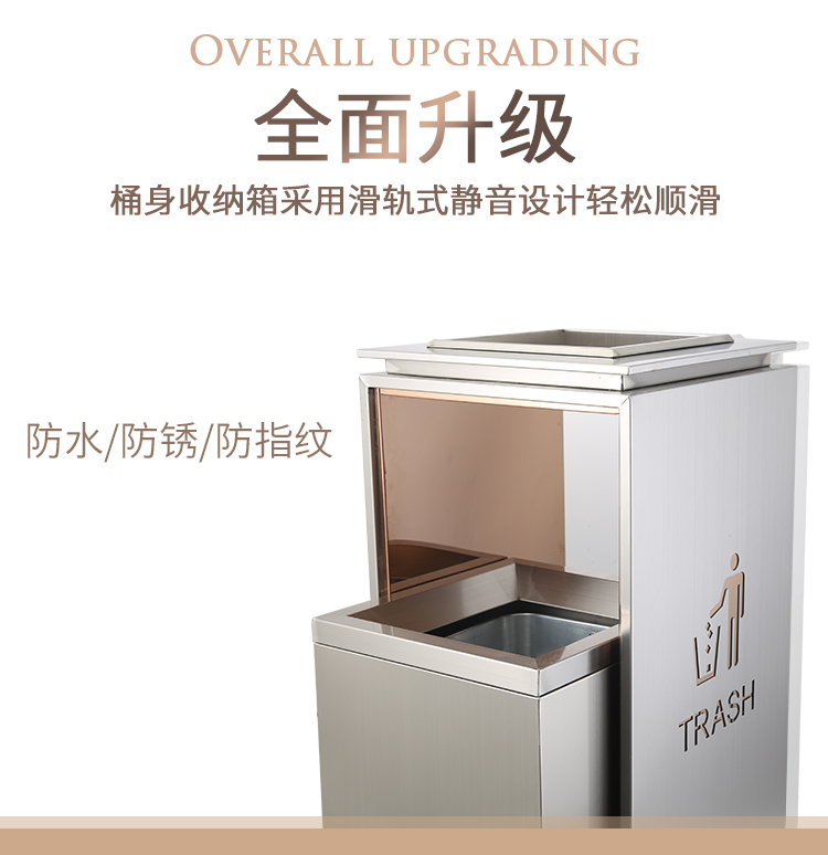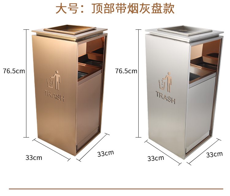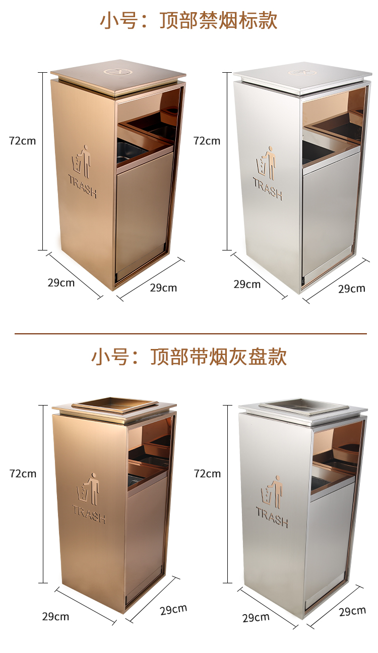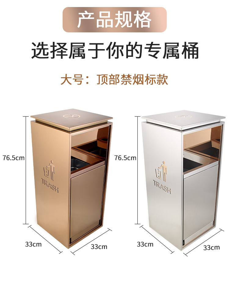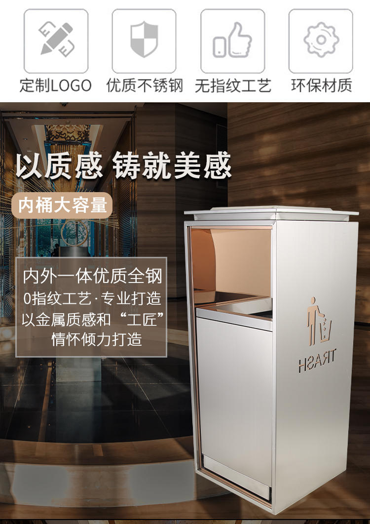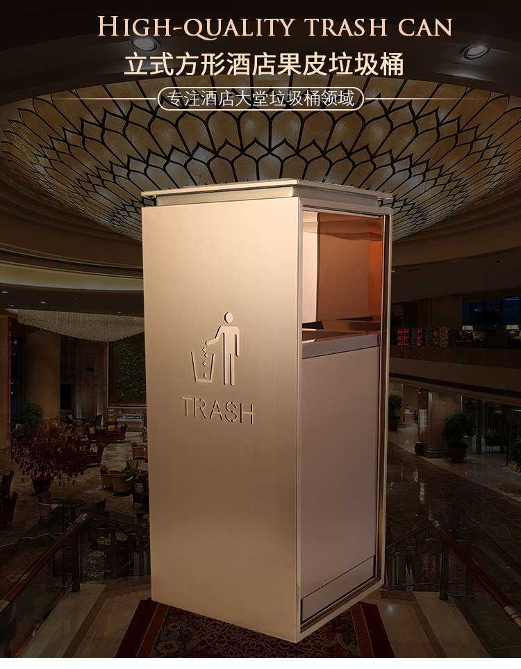 不銹鋼垃圾桶HT-BXG110,該產(chǎn)品整體采用優(yōu)質(zhì)的不銹鋼鋼板生產(chǎn)加工而成,產(chǎn)品顏色為:銀色,規(guī)格為長330mm寬330mm高765mm,本款酒店座地垃圾桶采用模具沖壓或折邊拼焊成型;表面處理有鏡面與砂面兩種。金屬框架選用高品質(zhì)鋼板折邊拼焊成型,表面防銹處理后經(jīng)戶外粉末噴涂;木材經(jīng)烘干、打磨、倒角、防腐處理后表面噴涂進口抗紫外線聚脂漆。生產(chǎn)工藝:不銹鋼垃圾桶選用優(yōu)質(zhì)不銹鋼經(jīng)下料—折合—壓筋—沖孔―成型,氬氟焊、打磨、拋光、打臘。頂蓋采用滾壓成型技術,HT-BXG110不銹鋼垃圾桶也可按照您的具體需求標件產(chǎn)品不接受定制,詳見說明或咨詢客服.環(huán)泰愿為環(huán)保護航,一切為您,放心采購。