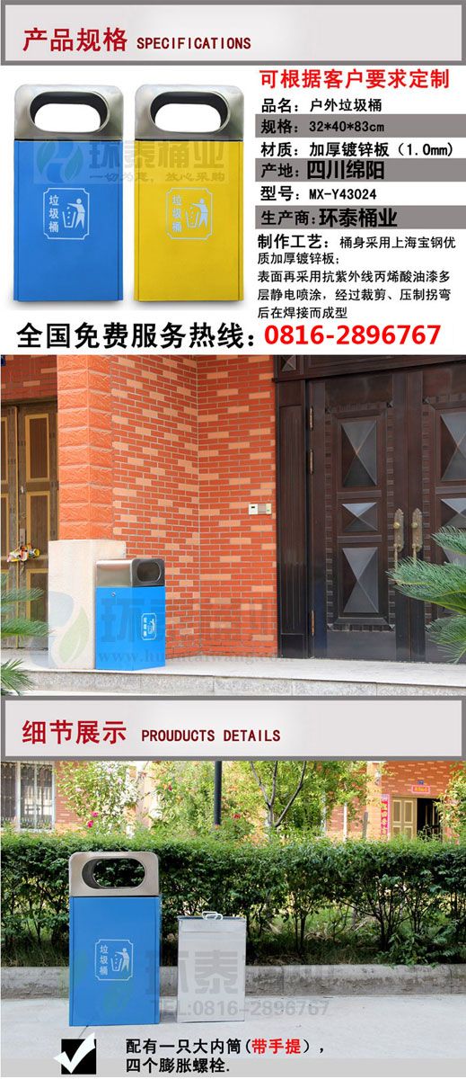 不銹鋼垃圾桶HT-BXG7840,該產(chǎn)品整體采用優(yōu)質(zhì)的鍍鋅鋼板生產(chǎn)加工而成,產(chǎn)品顏色為:黃色,規(guī)格為長320mm寬400mm高830mm,本款戶外雙面投扣不銹鋼垃圾桶整體采用優(yōu)質(zhì)鍍鋅板,經(jīng)折彎沖壓一次性成型.產(chǎn)品一律用室外粉靜電噴塑,經(jīng)過180°的高溫,限度延長了垃圾桶的使用壽命,使垃圾桶顏色持久不變,亮麗如新.表面經(jīng)除油——清洗——酸洗——清洗——表調(diào)——磷化——清洗——烘干——靜電粉末噴涂——高溫塑化——冷卻.噴涂粉末經(jīng)ISO9002質(zhì)量體系認(rèn)證,易保潔表面光滑之優(yōu)點(diǎn),不脫落,不起層。,HT-BXG7840不銹鋼垃圾桶也可按照您的具體需求可定制尺寸和顏色,可印制LOGO及文字,詳見說明或咨詢客服.環(huán)泰愿為環(huán)保護(hù)航,一切為您,放心采購。