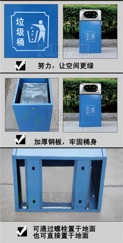 鋼制垃圾桶一種存放垃圾的容器,使用冷軋鋼板或者鍍鋅鋼板制作而成.因?yàn)楫a(chǎn)品表面經(jīng)過噴塑和酸處理,防腐蝕性能更高.采用酸處理+噴塑處理,更利于防銹,增加使用壽命.這是鋼制垃圾箱所具有的強(qiáng)大的優(yōu)勢(shì).