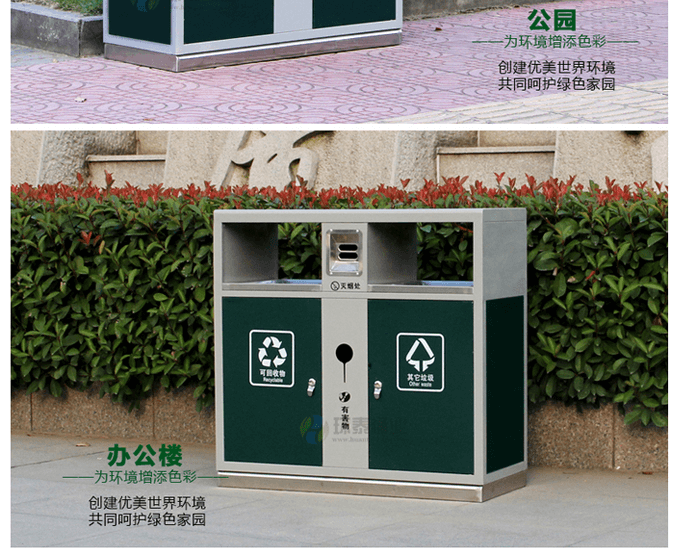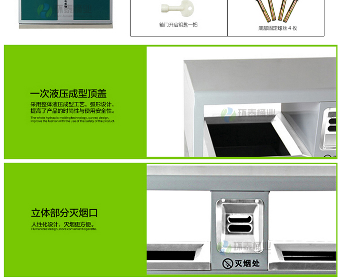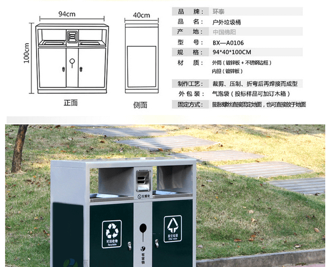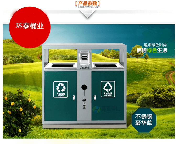 不銹鋼垃圾桶HT-BXG1640,該產(chǎn)品整體采用優(yōu)質(zhì)的不銹鋼鋼板生產(chǎn)加工而成,產(chǎn)品顏色為:白色,淺藍色,規(guī)格為長940mm寬400mm高1000mm,本款不銹鋼戶外垃圾桶采用模具沖壓或折邊拼焊成型;表面處理有鏡面與砂面兩種。金屬框架選用高品質(zhì)鋼板折邊拼焊成型,表面防銹處理后經(jīng)戶外粉末噴涂;木材經(jīng)烘干、打磨、倒角、防腐處理后表面噴涂進口抗紫外線聚脂漆。生產(chǎn)工藝:不銹鋼垃圾桶選用優(yōu)質(zhì)不銹鋼經(jīng)下料—折合—壓筋—沖孔―成型,氬氟焊、打磨、拋光、打臘。頂蓋采用滾壓成型技術(shù),HT-BXG1640不銹鋼垃圾桶也可按照您的具體需求僅定制顏色,可印制LOGO及文字,詳見說明或咨詢客服.環(huán)泰愿為環(huán)保護航,一切為您,放心采購。
