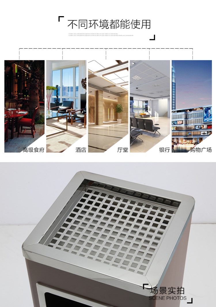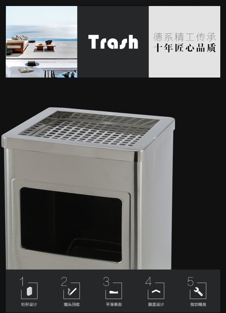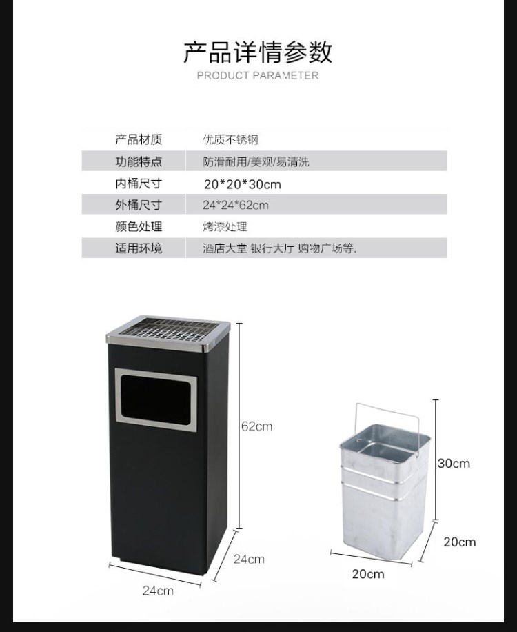 不銹鋼垃圾桶HT-BXG8177,該產(chǎn)品整體采用優(yōu)質(zhì)的不銹鋼鋼板生產(chǎn)加工而成,產(chǎn)品顏色為:不銹鋼原色,規(guī)格為長240mm寬240mm高620mm,本款正方形麗格不銹鋼垃圾桶采用模具沖壓或折邊拼焊成型;表面處理有鏡面與砂面兩種。金屬框架選用高品質(zhì)鋼板折邊拼焊成型,表面防銹處理后經(jīng)戶外粉末噴涂;木材經(jīng)烘干、打磨、倒角、防腐處理后表面噴涂進口抗紫外線聚脂漆。生產(chǎn)工藝:不銹鋼垃圾桶選用優(yōu)質(zhì)不銹鋼經(jīng)下料—折合—壓筋—沖孔―成型,氬氟焊、打磨、拋光、打臘。頂蓋采用滾壓成型技術,HT-BXG8177不銹鋼垃圾桶也可按照您的具體需求可定制尺寸和顏色,可印制LOGO及文字,詳見說明或咨詢客服.環(huán)泰愿為環(huán)保護航,一切為您,放心采購。