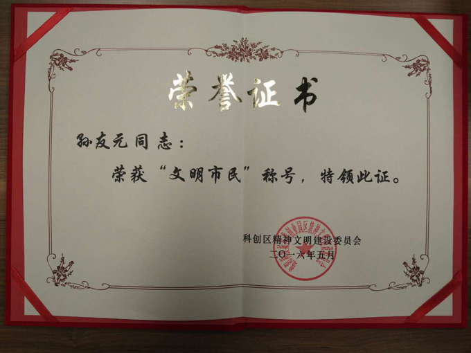 熱烈祝賀我司總經(jīng)理孫友元榮獲綿陽(yáng)科創(chuàng)園區(qū)“文明市民”榮譽(yù)稱號(hào)