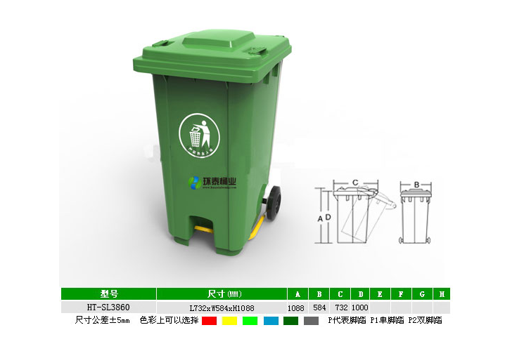 塑料垃圾桶HT-SL3860該產(chǎn)品整體采用優(yōu)質(zhì)的高密度聚乙烯(HDPE)生產(chǎn)加工而成,產(chǎn)品顏色為:綠色,規(guī)格為長732mm寬584mm高1088mm,本款戶外腳踏240L塑料垃圾桶采用工程塑料制造,100%的高密度聚乙烯或者是聚丙烯為原材料經(jīng)過嚴(yán)格的科學(xué)的注模工藝精制而成.針對目前市場上使用的產(chǎn)品情況和經(jīng)常出現(xiàn)的問題在塑料垃圾桶底部上沿口都做了加強(qiáng)處理,在桶身的壁厚上采用非等厚設(shè)計原理,把薄弱環(huán)節(jié)加厚,所用輪子采用高承載力耐磨靜音輪,使用壽命超長