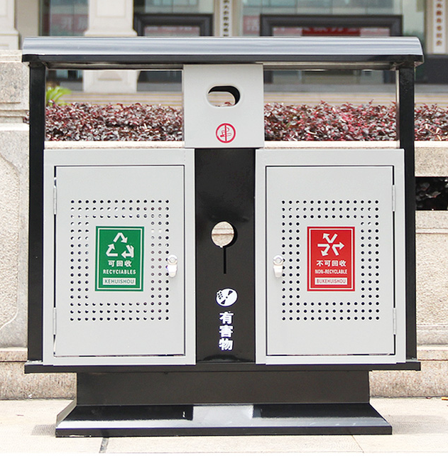 鋼制垃圾桶HT-GZ5690,該產(chǎn)品整體采用優(yōu)質(zhì)的鍍鋅鋼板生產(chǎn)加工而成,產(chǎn)品顏色為:黑灰色,規(guī)格為長1000mm寬350mm高1000mm,本款戶外分類鋼制北京桶整體采用優(yōu)質(zhì)鍍鋅板,經(jīng)折彎沖壓一次性成型.產(chǎn)品一律用室外粉靜電噴塑,經(jīng)過180°的高溫,限度延長了垃圾桶的使用壽命,使垃圾桶顏色持久不變,亮麗如新.表面經(jīng)除油——清洗——酸洗——清洗——表調(diào)——磷化——清洗——烘干——靜電粉末噴涂——高溫塑化——冷卻.噴涂粉末經(jīng)ISO9002質(zhì)量體系認(rèn)證,易保潔表面光滑之優(yōu)點(diǎn),不脫落,不起層。,HT-GZ5690鋼制垃圾桶也可按照您的具體需求可定制尺寸和顏色,可印制LOGO及文字
