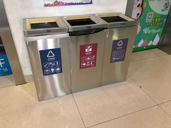 綿陽了樂薈城為響應(yīng)國家垃圾分類行動,在我司特別定制一批不銹鋼垃圾桶HT-BXG1690。