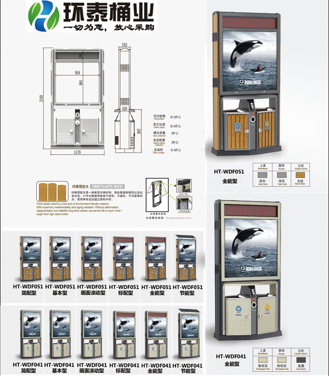 鋼木垃圾桶HT-WDF051,該產(chǎn)品整體采用優(yōu)質(zhì)的電解溶鍍鋅板生產(chǎn)加工而成,產(chǎn)品顏色為:深灰色+柚木色,規(guī)格為長(zhǎng)1170mm寬420mm高2160mm,本款萬德福鋼木廣告垃圾桶,HT-WDF051鋼木垃圾桶也可按照您的具體需求可印制LOGO及文字,詳見說明或咨詢客服.環(huán)泰愿為環(huán)保護(hù)航,一切為您,放心采購。