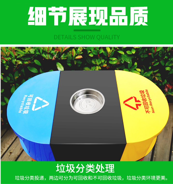 鋼木垃圾桶HT-GM6880,該產(chǎn)品整體采用優(yōu)質(zhì)的鍍鋅鋼板,防腐木生產(chǎn)加工而成,產(chǎn)品顏色為:黑色+原木色,規(guī)格為長(zhǎng)630mm寬380mm高850mm,本款戶(hù)外鋼木三色分類(lèi)垃圾桶制造工藝采用:1、鋼木垃圾桶桶身采用優(yōu)質(zhì)進(jìn)口防腐木、進(jìn)口山樟木或水曲柳制作,先經(jīng)過(guò)烘干脫水、壓刨、打磨、倒角、防腐處理后表面噴涂進(jìn)口抗紫外線聚脂漆等工序,再經(jīng)高溫噴塑處理,可抑制微生物的寄生、繁殖與蛀蝕,具有防水、防霉等保護(hù)功效,能夠抑制霉菌和藻類(lèi)生物的生長(zhǎng),可有效減少紫外線導(dǎo)致的褪色,延長(zhǎng)木材在戶(hù)外環(huán)境中的使用壽命.客戶(hù)也可以采用塑木代替實(shí)木.2、鋼木垃圾箱采用鍍鋅鋼板材質(zhì)制作,鋼結(jié)構(gòu)均經(jīng)過(guò)酸洗、磷化表面處理,然后再使用高溫噴塑工藝,使垃圾桶更加經(jīng)久耐用,防腐、防銹,美觀大方.3、鋼木果皮箱采用內(nèi)部膨脹螺栓固定的方式,不易推到,不易被偷盜,使垃圾桶更加安全牢實(shí).隱形固定還可以防止撞傷行人.