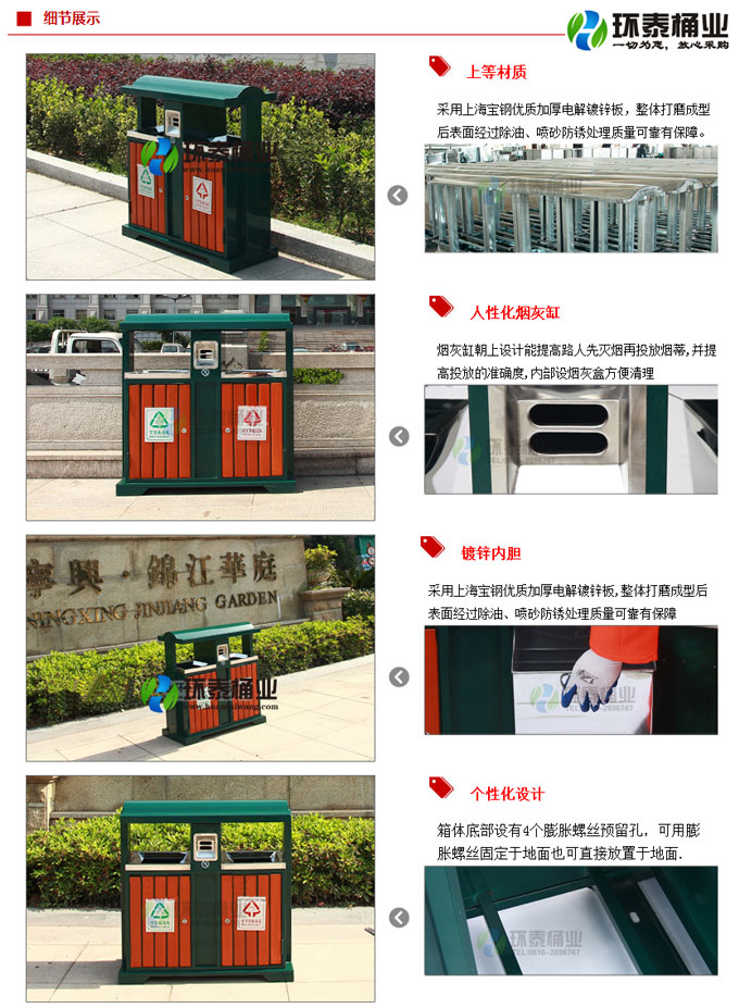 鋼木垃圾桶HT-GM6990,該產(chǎn)品整體采用優(yōu)質(zhì)的鍍鋅鋼板生產(chǎn)加工而成,產(chǎn)品顏色為:深綠色,規(guī)格為長950mm寬400mm高1000mm,本款新款分類鋼木垃圾桶制造工藝采用:1、鋼木垃圾桶桶身采用優(yōu)質(zhì)進口防腐木、進口山樟木或水曲柳制作,先經(jīng)過烘干脫水、壓刨、打磨、倒角、防腐處理后表面噴涂進口抗紫外線聚脂漆等工序,再經(jīng)高溫噴塑處理,可抑制微生物的寄生、繁殖與蛀蝕,具有防水、防霉等保護功效,能夠抑制霉菌和藻類生物的生長,可有效減少紫外線導致的褪色,延長木材在戶外環(huán)境中的使用壽命.客戶也可以采用塑木代替實木.2、鋼木垃圾箱采用鍍鋅鋼板材質(zhì)制作,鋼結(jié)構(gòu)均經(jīng)過酸洗、磷化表面處理,然后再使用高溫噴塑工藝,使垃圾桶更加經(jīng)久耐用,防腐、防銹,美觀大方.3、鋼木果皮箱采用內(nèi)部膨脹螺栓固定的方式,不易推到,不易被偷盜,使垃圾桶更加安全牢實.隱形固定還可以防止撞傷行人.