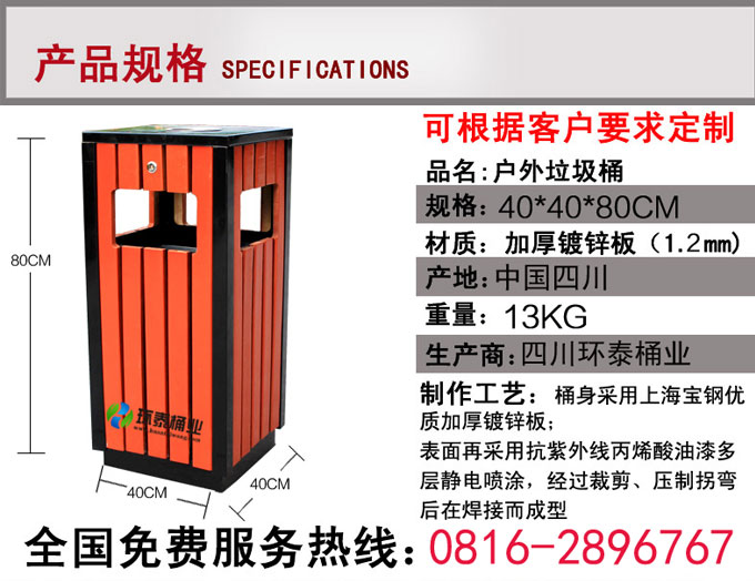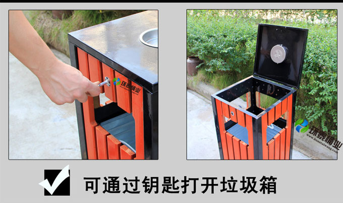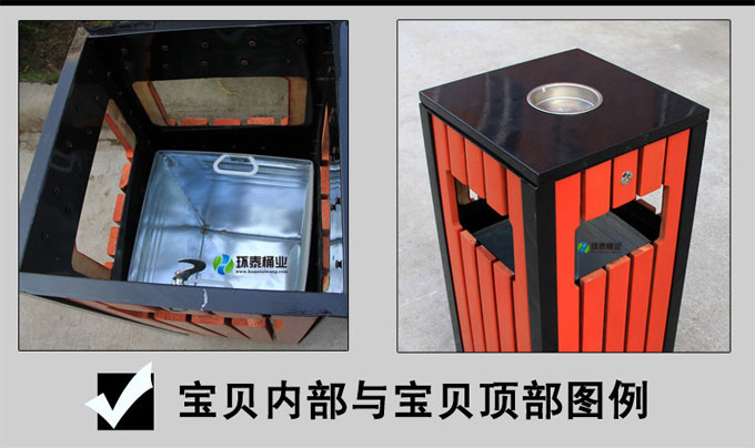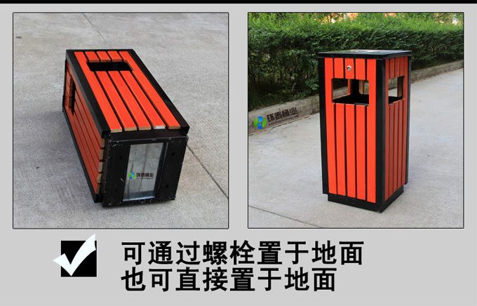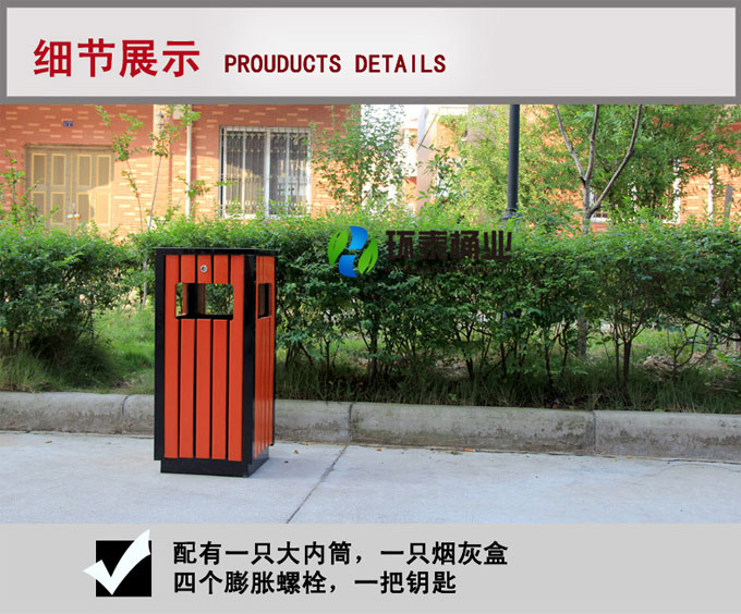 鋼木垃圾桶HT-GM6540,該產(chǎn)品整體采用優(yōu)質(zhì)的冷軋鋼板,鍍鋅鋼板,防腐木生產(chǎn)加工而成,產(chǎn)品顏色為:綠色+原木色,規(guī)格為長400mm寬400mm高800mm,本款四側(cè)面投口鋼木果皮箱制造工藝采用:1、鋼木垃圾桶桶身采用優(yōu)質(zhì)進口防腐木、進口山樟木或水曲柳制作,先經(jīng)過烘干脫水、壓刨、打磨、倒角、防腐處理后表面噴涂進口抗紫外線聚脂漆等工序,再經(jīng)高溫噴塑處理,可抑制微生物的寄生、繁殖與蛀蝕,具有防水、防霉等保護功效,能夠抑制霉菌和藻類生物的生長,可有效減少紫外線導致的褪色,延長木材在戶外環(huán)境中的使用壽命.客戶也可以采用塑木代替實木.2、鋼木垃圾箱采用鍍鋅鋼板材質(zhì)制作,鋼結(jié)構(gòu)均經(jīng)過酸洗、磷化表面處理,然后再使用高溫噴塑工藝,使垃圾桶更加經(jīng)久耐用,防腐、防銹,美觀大方.3、鋼木果皮箱采用內(nèi)部膨脹螺栓固定的方式,不易推到,不易被偷盜,使垃圾桶更加安全牢實.隱形固定還可以防止撞傷行人.