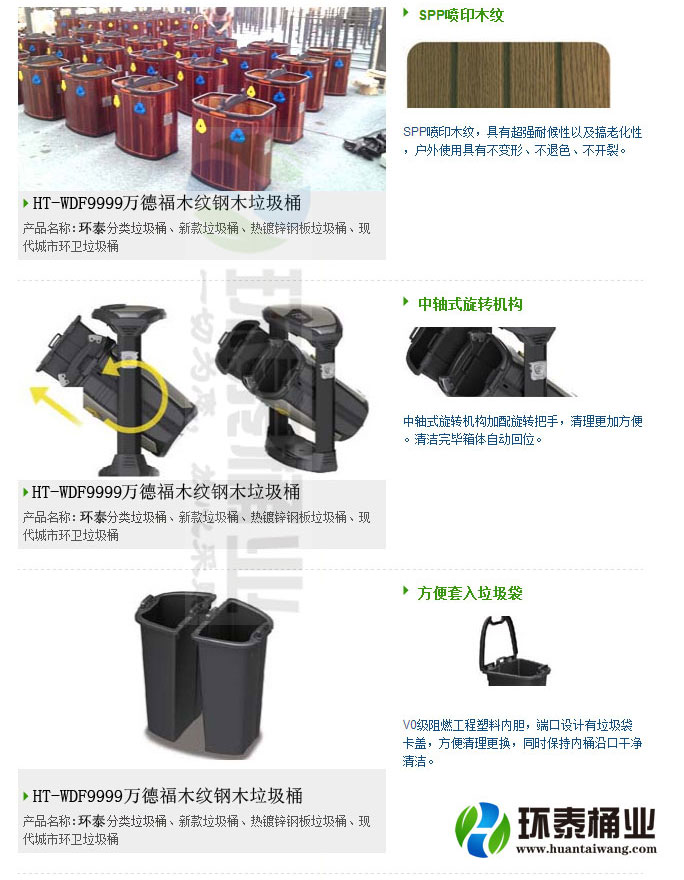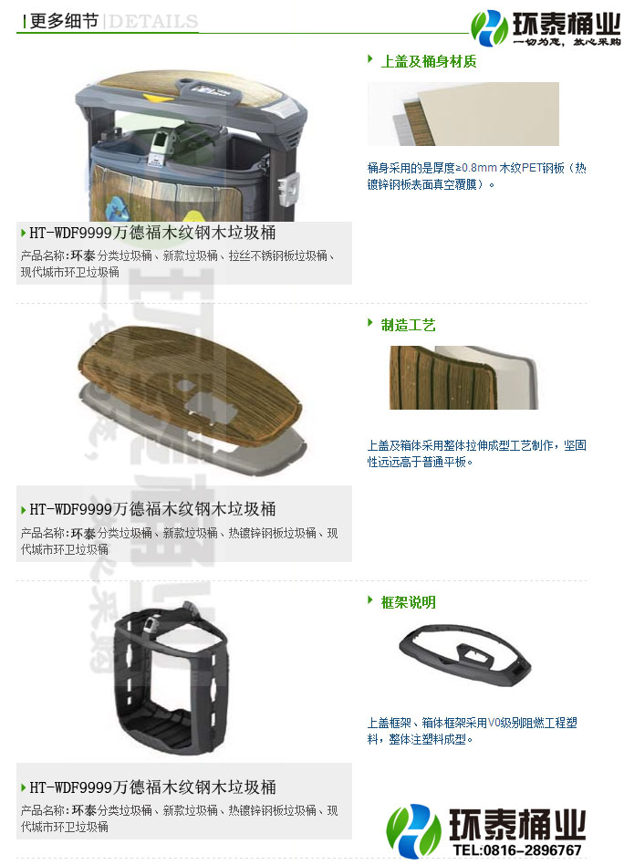 鋼木垃圾桶HT-WDF9999,該產(chǎn)品整體采用優(yōu)質(zhì)的電解溶鍍鋅板生產(chǎn)加工而成,產(chǎn)品顏色為:深灰+木紋色,規(guī)格為長(zhǎng)1104mm寬528高1047mm,本款萬(wàn)德福木紋鋼木垃圾桶特點(diǎn):具有VO阻燃、抗UV紫外線、防老化、耐腐蝕、增強(qiáng)塑料、整體模具拉伸、熱鍍鋅板、靜電噴涂、SPP噴印,生產(chǎn)工藝采用?,HT-WDF9999鋼木垃圾桶也可按照您的具體需求僅定制顏色,可印制LOGO及文字,詳見說(shuō)明或咨詢客服.環(huán)泰愿為環(huán)保護(hù)航,一切為您,放心采購(gòu)。