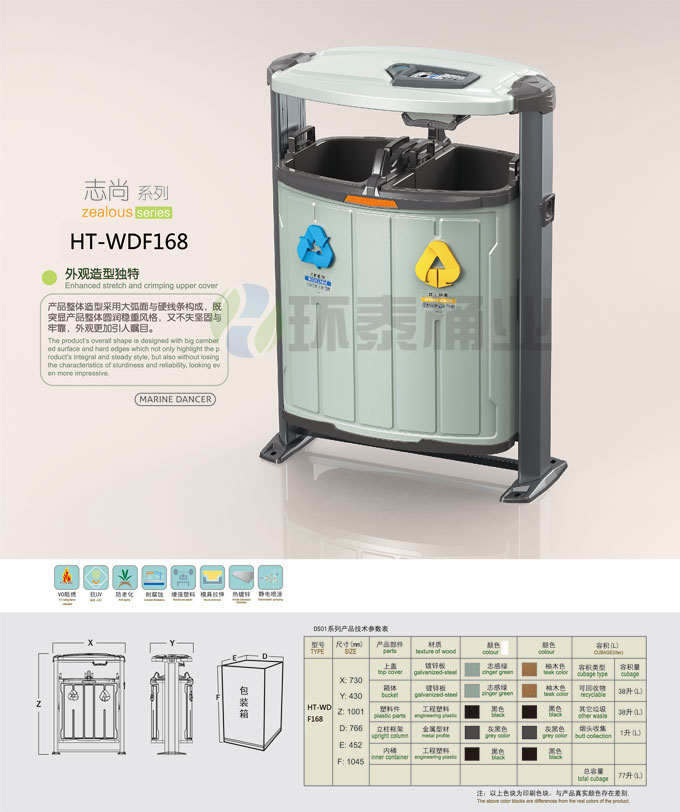 6、VO阻燃、抗老化、抗UV、高耐候、高強度工程塑料 產(chǎn)品所有塑料部件均采用V0阻燃級別、抗老化、抗UV、高耐候、高強度工程樹脂材料采用模具一次性注塑制成,在材料性能上不亞于金屬材質(zhì),整體生命周期卻遠(yuǎn)高于金屬部件1倍以上。,HT-WDF168鋼制垃圾桶也可按照您的具體需求僅定制顏色,詳見說明或咨詢客服.環(huán)泰愿為環(huán)保護(hù)航,一切為您,放心采購。
