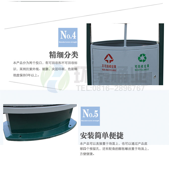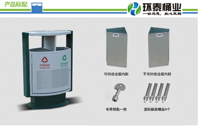 鋼制垃圾桶HT-GZ7780,該產(chǎn)品整體采用優(yōu)質(zhì)的鍍鋅鋼板生產(chǎn)加工而成,產(chǎn)品顏色為:白色、淺藍(lán)色,規(guī)格為長700mm寬400mm高950mm,本款街道鋼制分類垃圾桶整體采用優(yōu)質(zhì)鍍鋅板,經(jīng)折彎沖壓一次性成型.產(chǎn)品一律用室外粉靜電噴塑,經(jīng)過180°的高溫,限度延長了垃圾桶的使用壽命,使垃圾桶顏色持久不變,亮麗如新.表面經(jīng)除油——清洗——酸洗——清洗——表調(diào)——磷化——清洗——烘干——靜電粉末噴涂——高溫塑化——冷卻.噴涂粉末經(jīng)ISO9002質(zhì)量體系認(rèn)證,易保潔表面光滑之優(yōu)點(diǎn),不脫落,不起層。,HT-GZ7780鋼制垃圾桶也可按照您的具體需求僅定制顏色,可印制LOGO及文字,詳見說明或咨詢客服.環(huán)泰愿為環(huán)保護(hù)航,一切為您,放心采購。