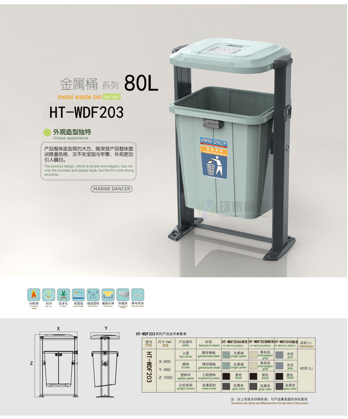 鋼制垃圾桶HT-WDF203,該產(chǎn)品整體采用優(yōu)質(zhì)的冷軋鋼板,塑料生產(chǎn)加工而成,產(chǎn)品顏色為:志綠色,規(guī)格為長(zhǎng)600mm寬460mm高1000mm,本款萬(wàn)德福單桶戶外塑料垃圾桶桶身材料采用熱鍍鋅電解冷軋鋼板作為基材,并使用冷拉伸一次成型,沿口周邊設(shè)計(jì)有內(nèi)卷邊,使沿口更加堅(jiān)固耐用。立柱截面使用梯形造型,內(nèi)側(cè)面設(shè)計(jì)有加強(qiáng)型壓制溝槽,立柱材料采用熱鍍鋅電解冷軋鋼板作為基材,通過(guò)冷壓卷曲工藝成型。整體抗扭屈、抗沖擊強(qiáng)度是普通方管或圓管的1.5倍以上。支架上下梁采用熱鍍鋅方管,與立柱使用穿透式焊接工藝,支架整體牢固提高兩倍以上。,HT-WDF203鋼制垃圾桶也可按照您的具體需求可印制LOGO及文字,詳見(jiàn)說(shuō)明或咨詢客服.環(huán)泰愿為環(huán)保護(hù)航,一切為您,放心采購(gòu)。