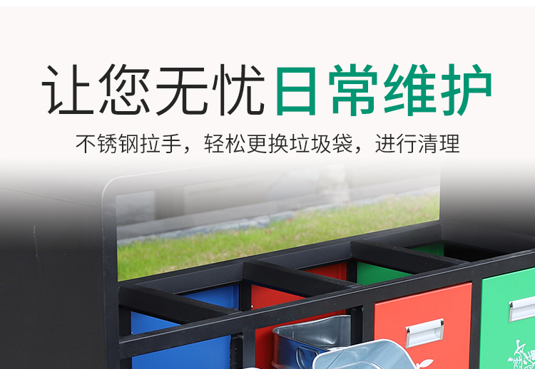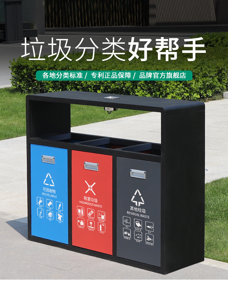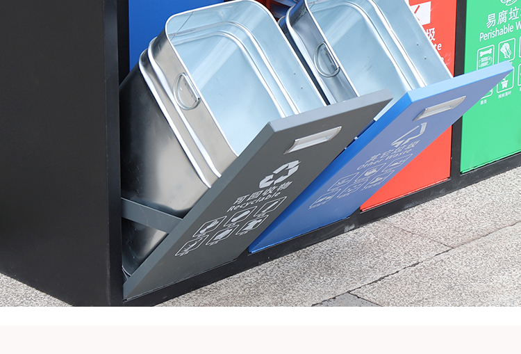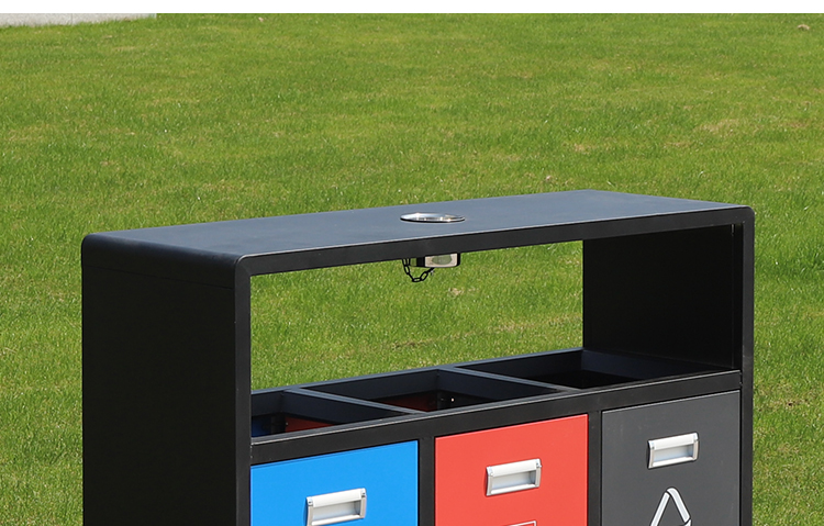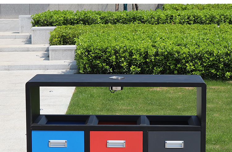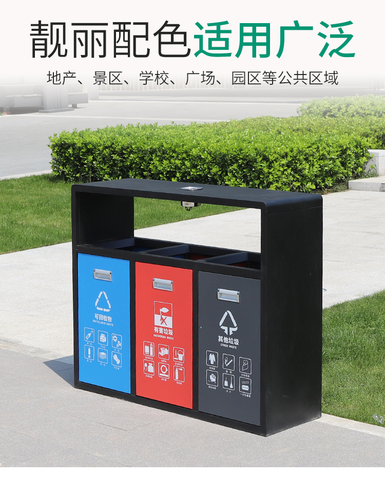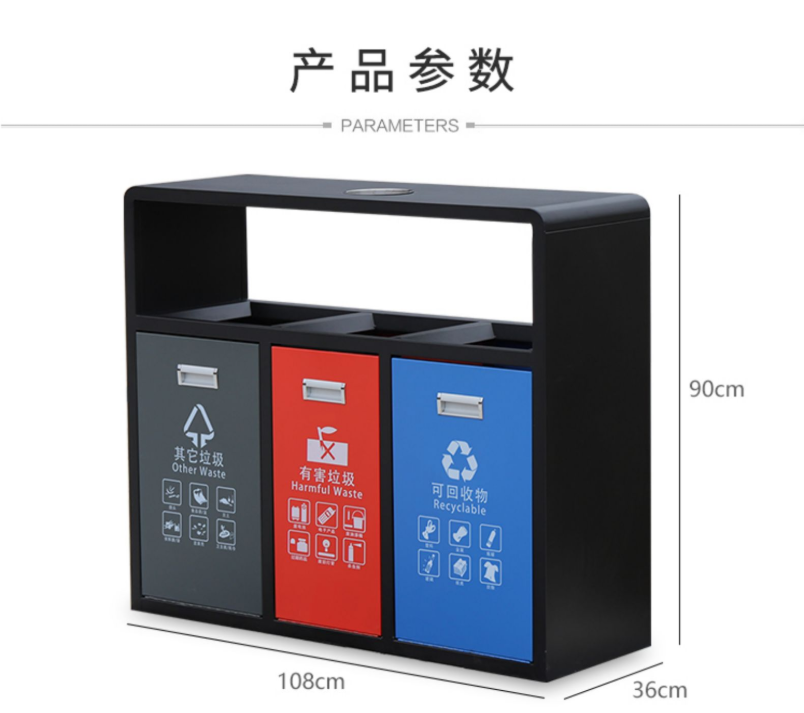 鋼制垃圾桶HT-GZ5760,該產(chǎn)品整體采用優(yōu)質(zhì)的冷軋鋼板,鍍鋅鋼板生產(chǎn)加工而成,產(chǎn)品顏色為:黑 紅 藍(lán),規(guī)格為長(zhǎng)1080mm寬360mm高900mm,本款戶外三分類鋼制垃圾桶整體采用優(yōu)質(zhì)冷軋鋼板,經(jīng)折彎沖壓一次性成型.產(chǎn)品一律用室外粉靜電噴塑,經(jīng)過(guò)180°的高溫,限度延長(zhǎng)了垃圾桶的使用壽命,使垃圾桶顏色持久不變,亮麗如新.表面經(jīng)除油——清洗——酸洗——清洗——表調(diào)——磷化——清洗——烘干——靜電粉末噴涂——高溫塑化——冷卻.噴涂粉末經(jīng)ISO9002質(zhì)量體系認(rèn)證,易保潔表面光滑之優(yōu)點(diǎn),不脫落,不起層,HT-GZ5760鋼制垃圾桶也可按照您的具體需求可定制尺寸和顏色,可印制LOGO及文字,詳見說(shuō)明或咨詢客服.環(huán)泰愿為環(huán)保護(hù)航,一切為您,放心采購(gòu)。