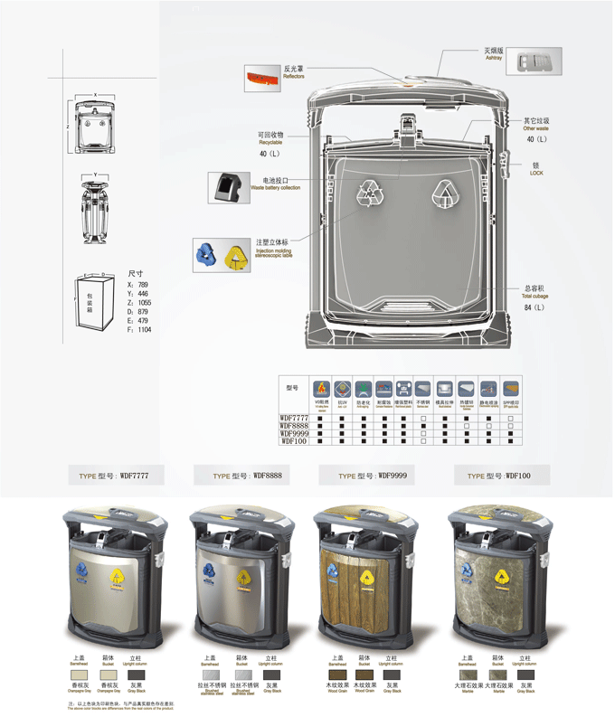 鋼制垃圾桶HT-WDF100,該產(chǎn)品整體采用優(yōu)質(zhì)的電解溶鍍鋅板生產(chǎn)加工而成,產(chǎn)品顏色為:深灰+黑色,規(guī)格為長1104mm寬528高1047mm,本款萬德福大理石紋鋼木垃圾桶1、鋼塑復(fù)合設(shè)計,減少焊接,兼顧強度與美觀;