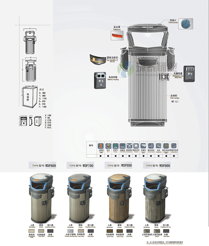 鋼制垃圾桶HT-WDF900,該產(chǎn)品整體采用優(yōu)質(zhì)的電解溶鍍鋅板生產(chǎn)加工而成,產(chǎn)品顏色為:大理石紋顏色,規(guī)格為長560mm寬600mm高1118mm,本款德瀾仕大理石紋垃圾桶特點:具有VO阻燃、抗UV紫外線、防老化、耐腐蝕、增強塑料、整體模具拉伸、熱鍍鋅板、靜電噴涂、電泳、鋁合金型材、陽極化處理,生產(chǎn)工藝采用?,HT-WDF900鋼制垃圾桶也可按照您的具體需求僅定制顏色,可印制LOGO及文字,詳見說明或咨詢客服.環(huán)泰愿為環(huán)保護航,一切為您,放心采購。