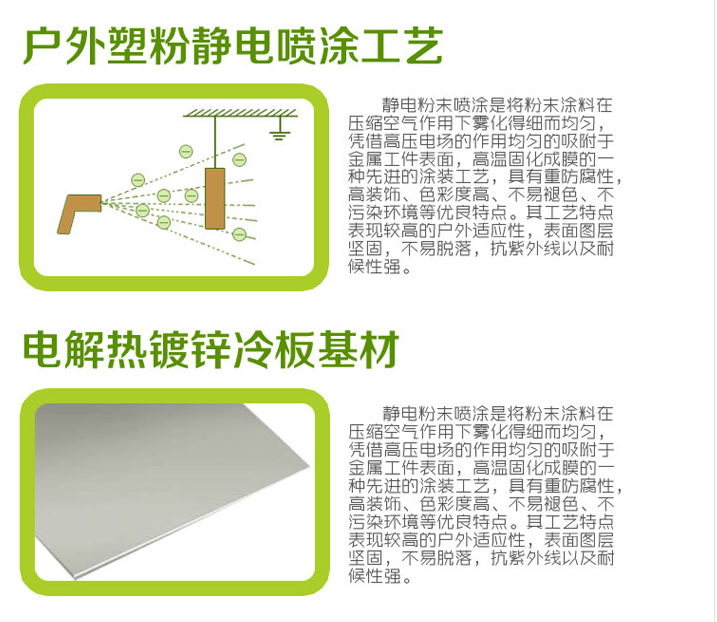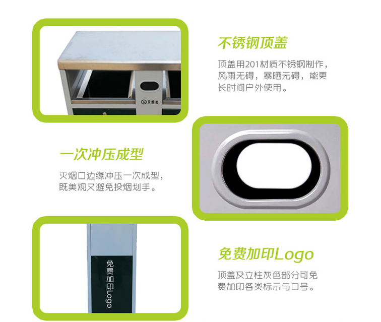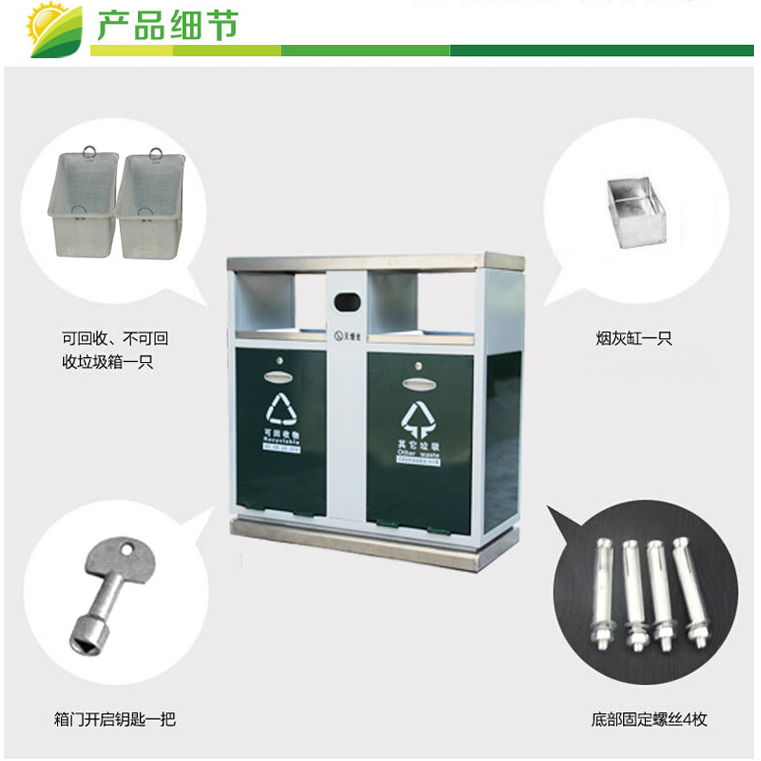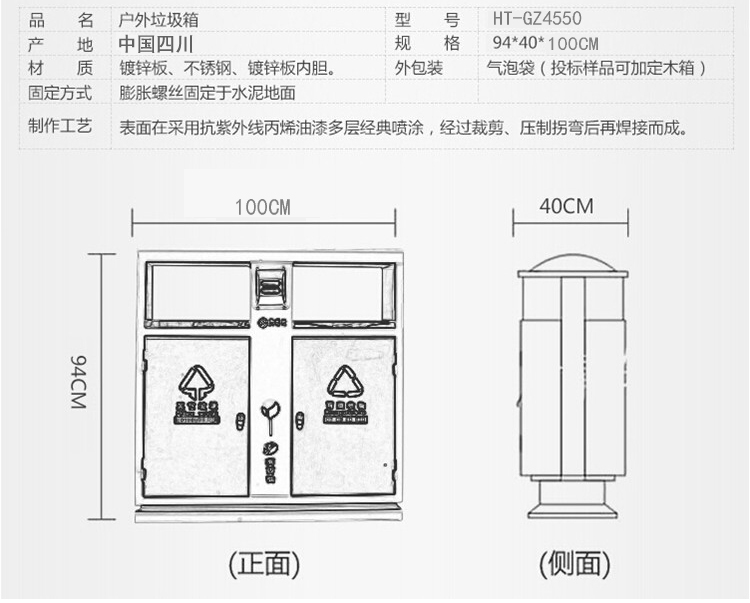 鋼制垃圾桶HT-GZ4550,該產(chǎn)品整體采用優(yōu)質(zhì)的冷軋鋼板,鍍鋅鋼板生產(chǎn)加工而成,產(chǎn)品顏色為:灰/綠色,規(guī)格為長(zhǎng)940mm寬400mm高1000mm,本款戶外不銹鋼包邊永康桶HT-GZ4550整體采用優(yōu)質(zhì)冷軋鋼板,經(jīng)折彎沖壓一次性成型.產(chǎn)品一律用室外粉靜電噴塑,經(jīng)過(guò)180°的高溫,限度延長(zhǎng)了垃圾桶的使用壽命,使垃圾桶顏色持久不變,亮麗如新.表面經(jīng)除油——清洗——酸洗——清洗——表調(diào)——磷化——清洗——烘干——靜電粉末噴涂——高溫塑化——冷卻.噴涂粉末經(jīng)ISO9002質(zhì)量體系認(rèn)證,易保潔表面光滑之優(yōu)點(diǎn),不脫落,不起層,HT-GZ4550鋼制垃圾桶也可按照您的具體需求可定制尺寸和顏色,可印制LOGO及文字,詳見(jiàn)說(shuō)明或咨詢客服.環(huán)泰愿為環(huán)保護(hù)航,一切為您,放心采購(gòu)。
