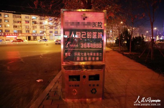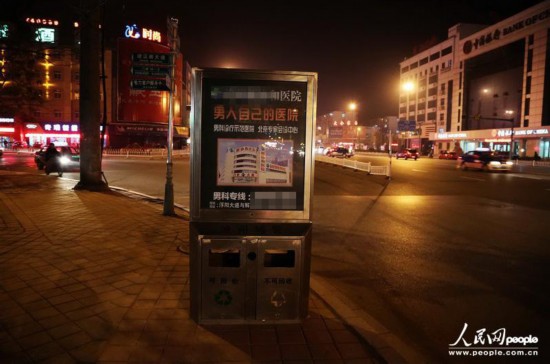 人民網(wǎng)北京11月28日電“一個(gè)挨著一個(gè),成滄州一景”、“(這些廣告)幾乎都是下三路”,日前有網(wǎng)民發(fā)帖稱,河北滄州街頭現(xiàn)數(shù)百“最牛”垃圾箱。標(biāo)有“滄州城管”字樣的垃圾箱上,遍布“男人自己的醫(yī)院”、“看男科,找××”、“治痔瘡,到××”等大幅醫(yī)療廣告,引起不少市民的反感。除了垃圾箱,這些廣告還登上了公交站牌。
