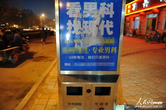 標(biāo)有“滄州城管”字樣的垃圾箱上,遍布“男人自己的醫(yī)院”、“看男科,找××”、“治痔瘡,到××”等大幅醫(yī)療廣告,引起不少市民的反感。