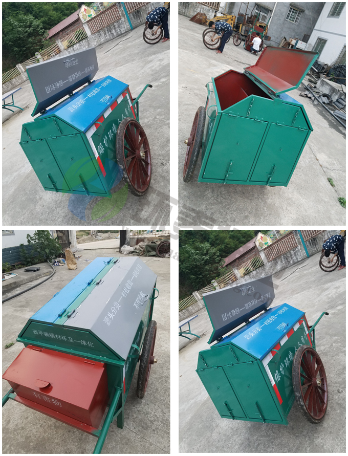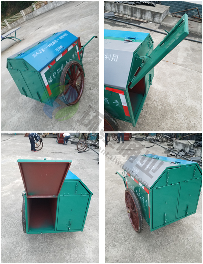 ISO9002質(zhì)量體系認證,易保潔表面光滑之優(yōu)點,不脫落,不起層;3.箱體長度:長1000mm*寬650mm*高650mm;4.輪胎采用實心胎;5.把手處帶有防滑把手;6.箱體后方需帶有長250mm,寬500mm,高350mm裝放有毒有害垃圾,需噴紅色,印制“有害物”;7.車箱需有反光標識;8.傾倒方式采用上投放,前傾倒。箱體正面需雙開門分別傾倒可分類垃圾與不可分類垃圾,前傾倒需保證可單邊操作,即前傾倒門;9.需將可分類與不可分類到垃圾中間處分離,中間采用1.5mm鍍鋅板走底部到投頭出連接。10.箱體兩側(cè)需分別制作2個掛鉤。
