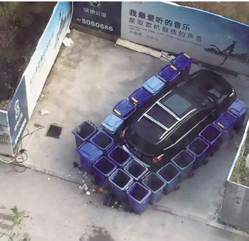 網(wǎng)友發(fā)帖:越野車(chē)遭垃圾桶“圍困”