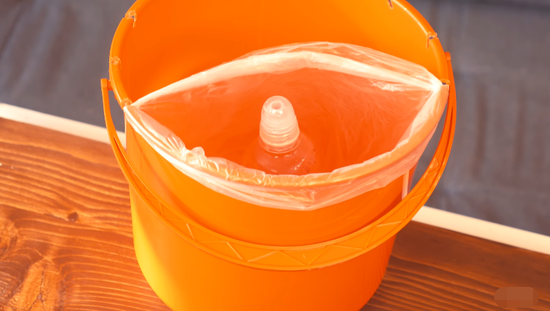 然后,我們就能放上袋子,把塑料袋的袋口套在切口上面。