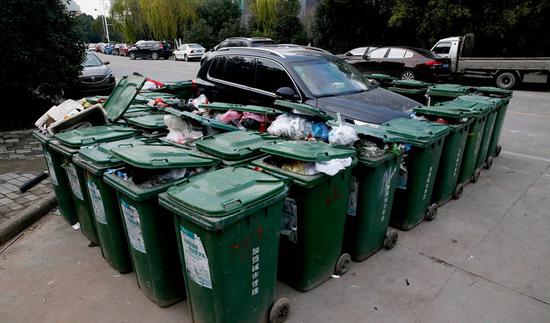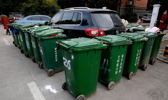 記者在現(xiàn)場看到,每個(gè)垃圾桶都有一米多高,近半米寬。遠(yuǎn)遠(yuǎn)地看過去,私家車只露出了車頂部分。