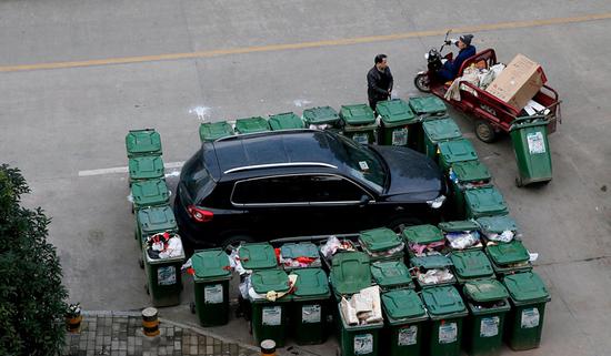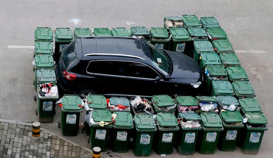 12月17日下午4點(diǎn)多,安徽合肥市龍圖路翠庭園小區(qū)北門外,一輛停在路口皖A(yù)牌照的SUV私家車因占用垃圾中轉(zhuǎn)點(diǎn)停車,被四十多個(gè)垃圾桶圍得“水泄不通”。