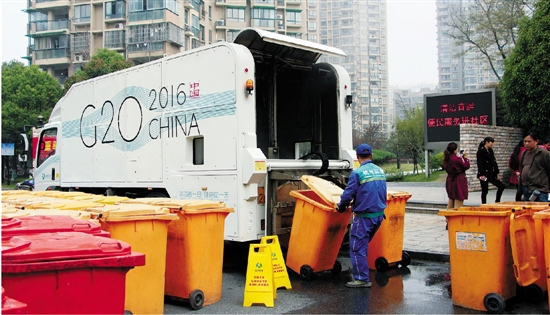 這輛車的大小與平時清潔直運車一般,車身繪有“G20峰會”圖案,因為它最早就是在峰會期間提供保障服務(wù)的。工作人員下車后,簡單介紹操作流程,然后就開工洗垃圾桶了。