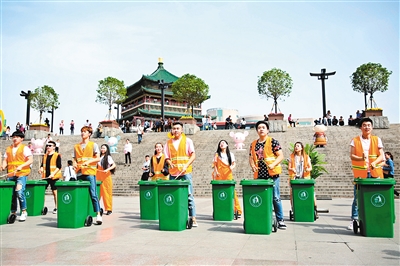 昨日15時,鐘樓金花廣場行人如織。突然,10個綠色的垃圾桶被人搬進了廣場。10名身穿黃色保潔衣服的青年男女,用木棍在垃圾桶上敲打起來,奏響了美妙的樂章。原來是共青團陜西省委聯(lián)合西安音樂學院團委,在西安市鐘樓金花廣場為全省廣大青年們送出了一份特別的禮物—— “快閃”秀,以這種青年人的方式慶祝五四青年節(jié)。