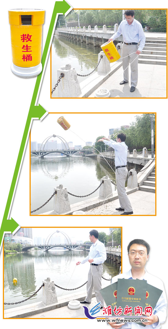 李迪說,當(dāng)時他在老家高密上班,看到這件事后他很感動,就經(jīng)常到一些公園尋找靈感。他發(fā)現(xiàn),一般市內(nèi)的水域旁邊除了垃圾桶,別的公共設(shè)施非常少,因此他決定發(fā)明一種可以救生的垃圾桶!鞍丫壬髯龀衫坝泻芏嗪锰帲綍r可以收集垃圾,當(dāng)遇到落水者時,就可以變身為救生工具,而且不易丟失。”李迪說。