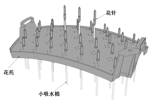 2.將帶有細吸水介質(zhì)的花針依次從花托上部的花針孔內(nèi)插入。(如下圖)
