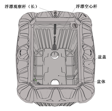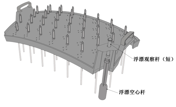 1.取出長浮漂的2個零件,將浮漂觀察桿(長)的下端從盆蓋凸臺孔穿入再與浮漂空心桿的上端連接。(如下圖)
