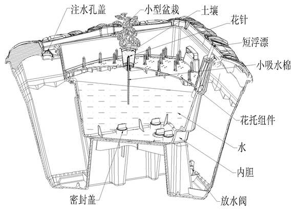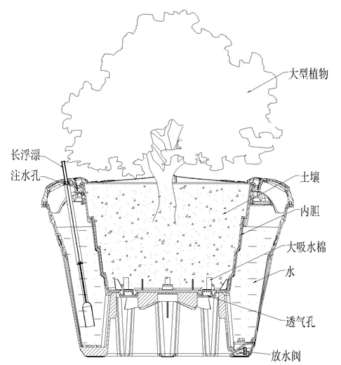產(chǎn)品通過不同的配置可實現(xiàn)栽種大型植物或者小型盆栽,產(chǎn)品帶有儲水裝置和自動供水裝置,可使花草時刻保持所需要的濕度,產(chǎn)品帶有浮漂,可顯示儲水裝置內(nèi)的水位,當水量不足時提示人員加水,本產(chǎn)品大大降低了澆水與維護的頻率。
